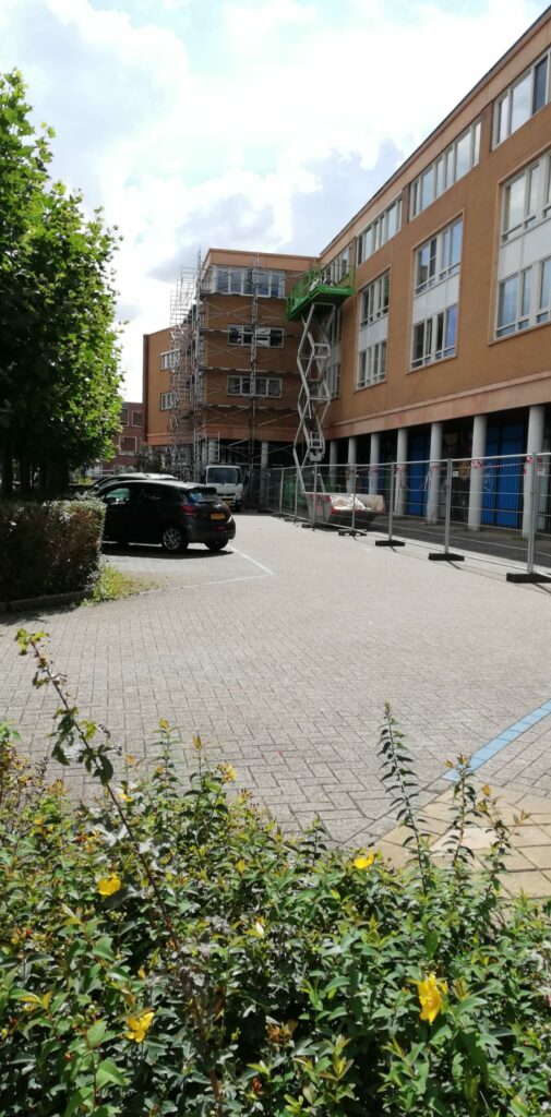 Foto van 30 augustus, met de steiger en de schaarlift met de nog witte pilaren aan de oostzijde.