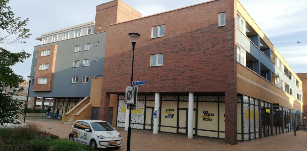 Foto van 3 september, goed te zien het verschil tussen grijze pilaren links en de nog witte pilaren bij Xenos.
