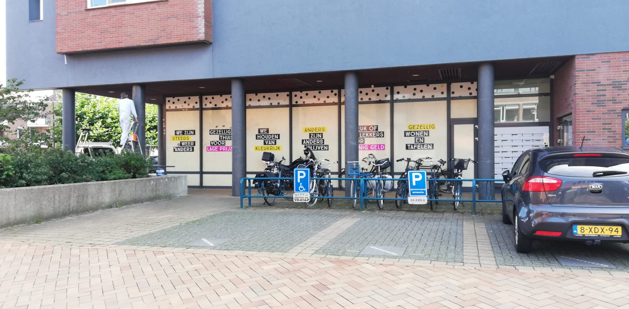 Op 30 augustus is een begin gemaakt met het schilderen van de pilaren waar ons pand zo herkenbaar aan is. De witte pilaren worden nu donkergrijs en dat is een heel ander gezicht. Het gebouw lijkt nu meer te gaan zweven, en dat geeft een hele nieuwe uitstraling.