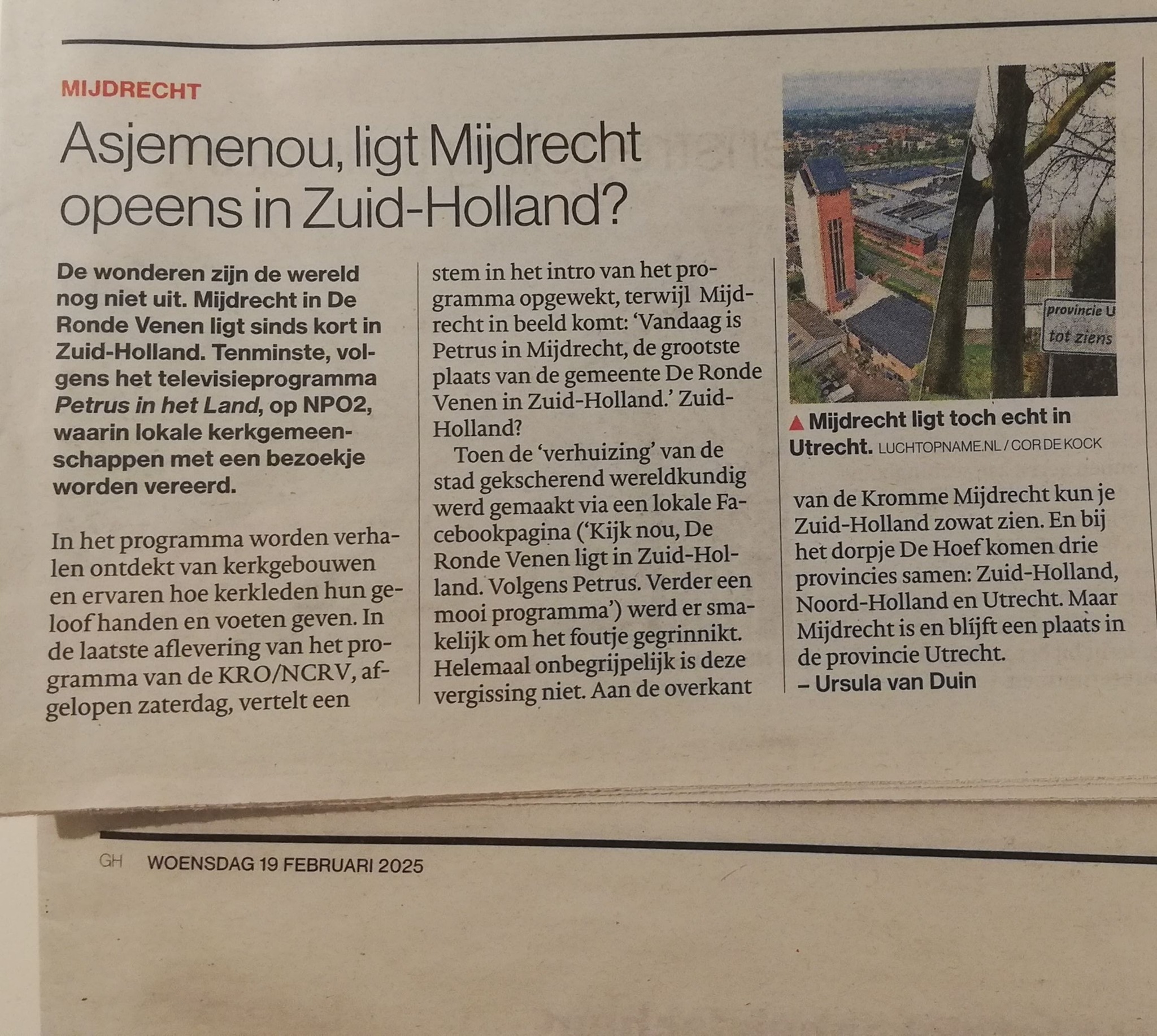 Asjemenou, ligt Mijdrecht opeens in Zuid-Holland?19 februari 2025Geschreven door Redactie Gelukkig, de ‘stad’ Mijdrecht ligt in Utrecht. Volgens het AD Groene Hart van afgelopen woensdag. Dus dan zal het wel kloppen. Toch?